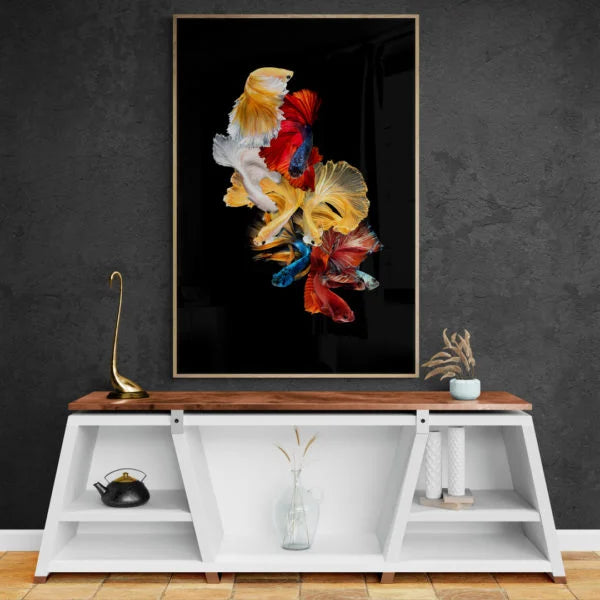 Immerse your space in graceful motion and vibrant color with Fluid Elegance, a stunning canvas artwork featuring colorful Betta fish set against a deep black background. The flowing fins and vivid hues of red, blue, and gold evoke a sense of serenity and sophistication, making this piece a perfect centerpiece for modern interiors.
