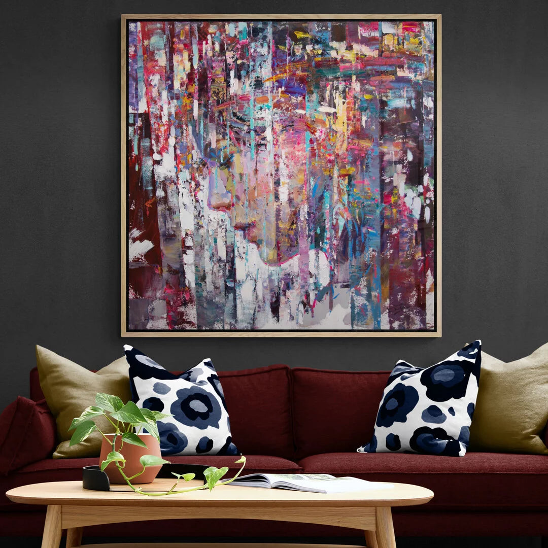 Set against a deep gray wall and paired with a rich maroon sofa and floral accent pillows, this artwork is ideal for luxury living rooms, art-inspired lounges, or designer studios. Its expressive brushwork and harmonious color palette make it a perfect choice for those seeking a balance between contemporary flair and upscale charm.
