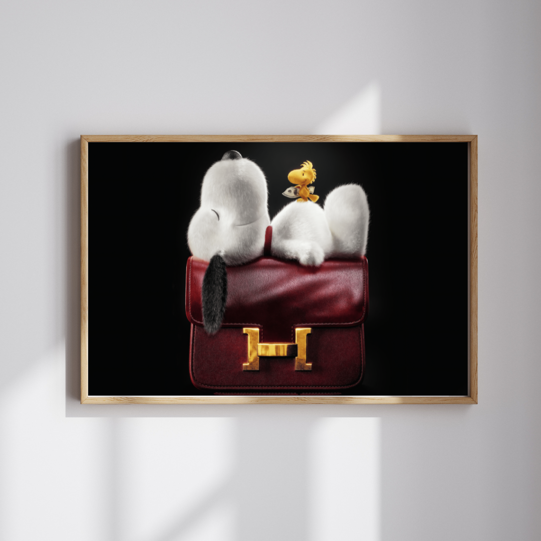 Celebrate timeless charm and playful elegance with Iconic Companions, a framed artwork featuring Snoopy and Woodstock from the beloved Peanuts series. Resting atop a vibrant red handbag with gold hardware, the characters are set against a sleek black background, creating a bold and stylish composition that blends pop culture with luxury fashion.