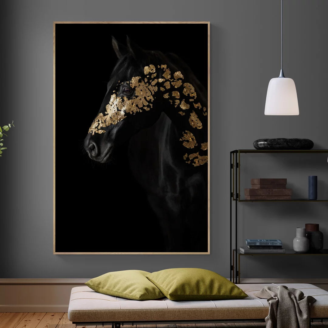Immerse your interior in timeless elegance with this exquisite canvas artwork, featuring a majestic black stallion adorned with radiant gold leaf detailing. Set against a deep, moody backdrop, the piece evokes power, prestige, and refinement. Perfectly suited for upscale living spaces, executive offices, or luxury lounges, this statement piece commands attention while harmonizing with sophisticated décor. Printed on premium-grade canvas with museum-quality finish, it’s a celebration of equine nobility and artistic grandeur.