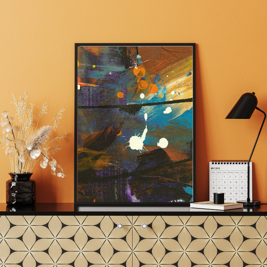 Displayed atop a patterned cabinet and styled with dried florals and minimalist lighting, this artwork enhances designer studios, creative workspaces, and stylish entryways. Its rich tones and geometric composition make it a versatile statement piece that complements both neutral and vibrant décor.